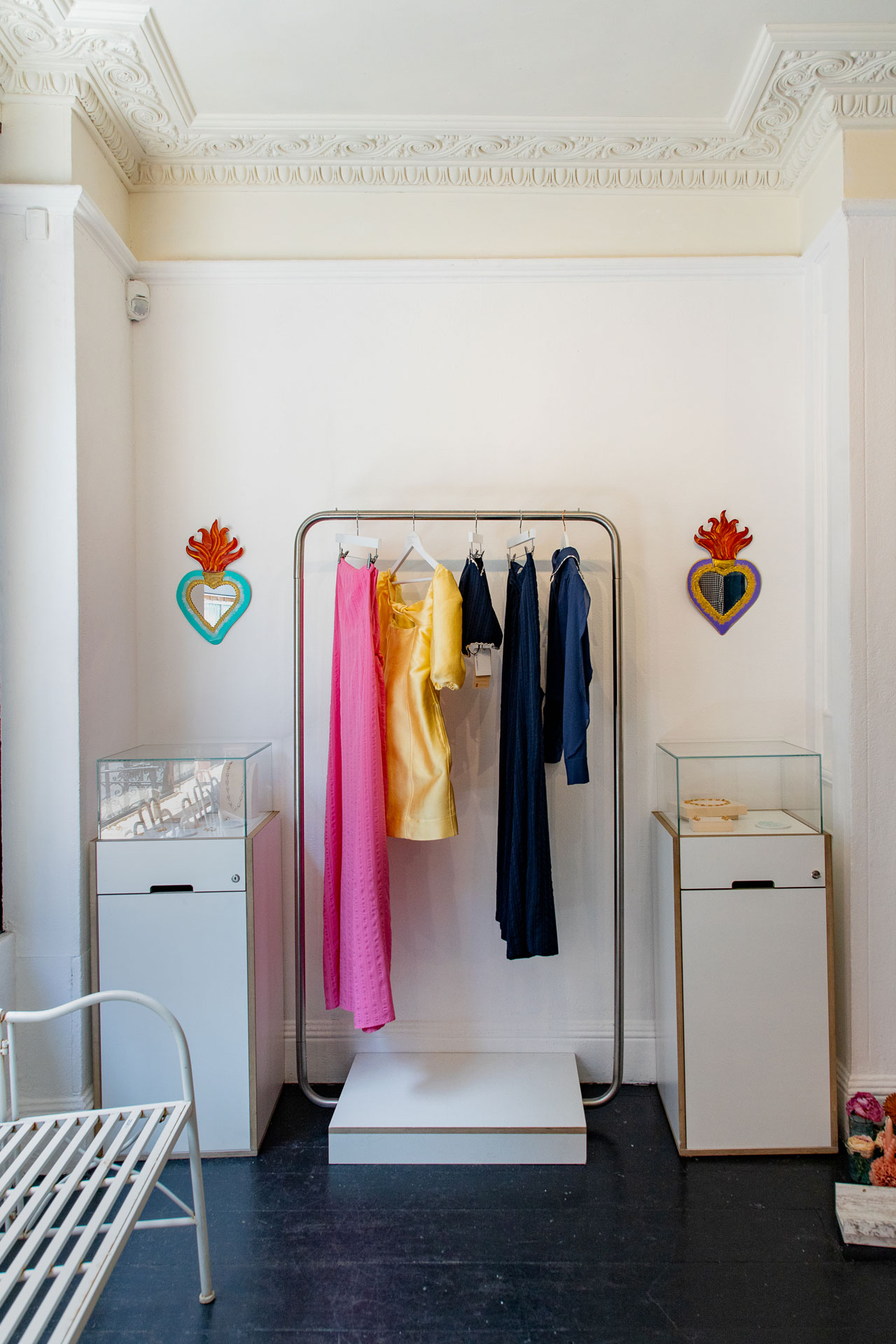 Designed to pair seamlessly with our rail systems, these sturdy bases offer a clean, low-level platform for visual merchandising—ideal for displaying shoes, accessories, or other small items. Bases and hanging rails are rented separately.