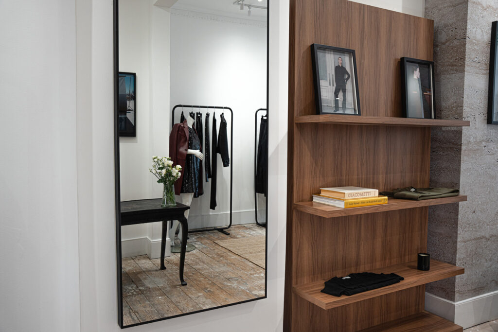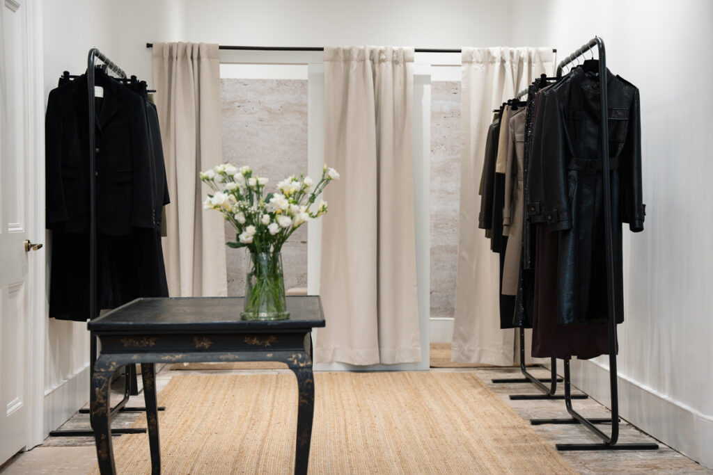 The boutique wasn’t just a retail space; it was an embodiment of de Piante’s commitment to sustainability and community. “From sustainably milled fabrics to in-house craftsmanship, every detail is designed with longevity and quality in mind” said de Piante. Her dedication to quality ensures that the brand’s designs stand the test of time, reflecting the values of a world increasingly moving away from fast fashion. This mindful approach resonated throughout the boutique, where FoundPop’s design-forward furniture rentals helped transform the space.